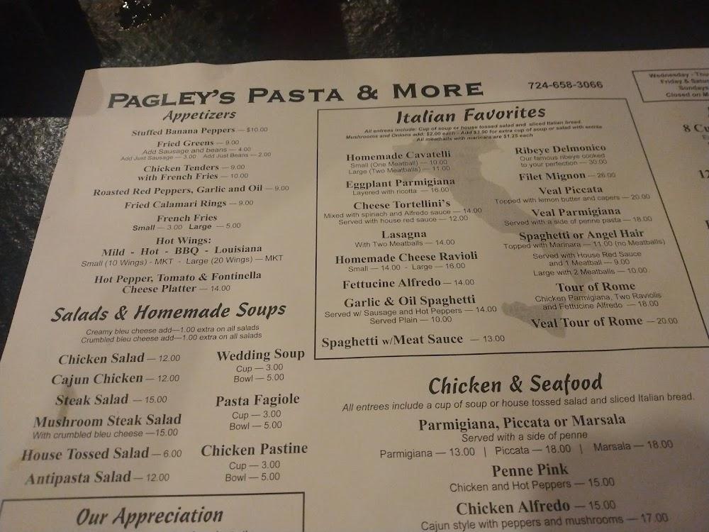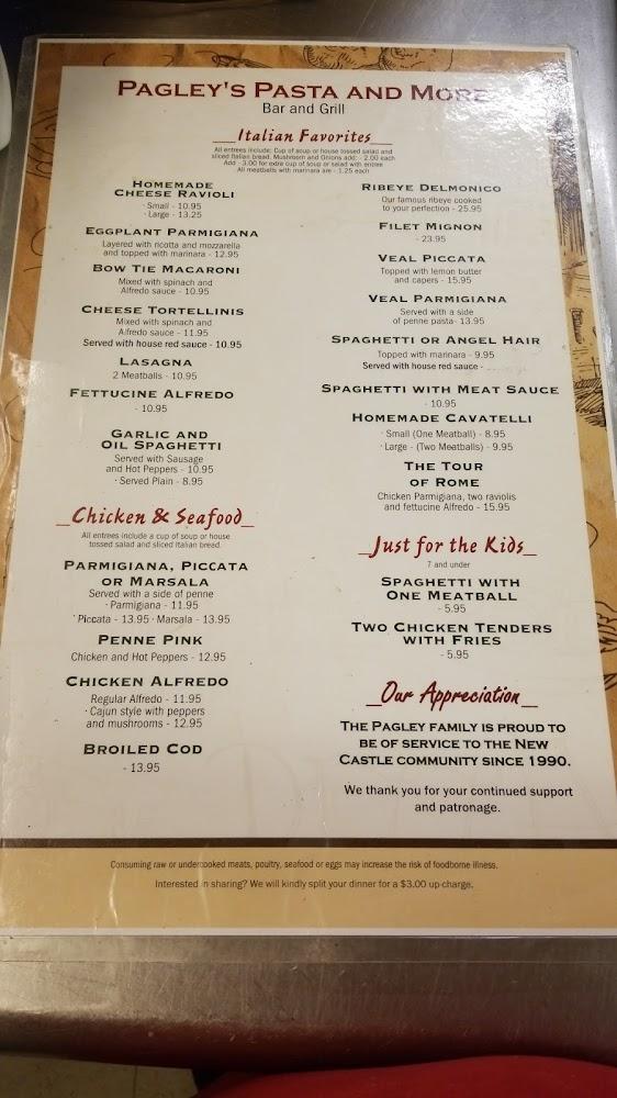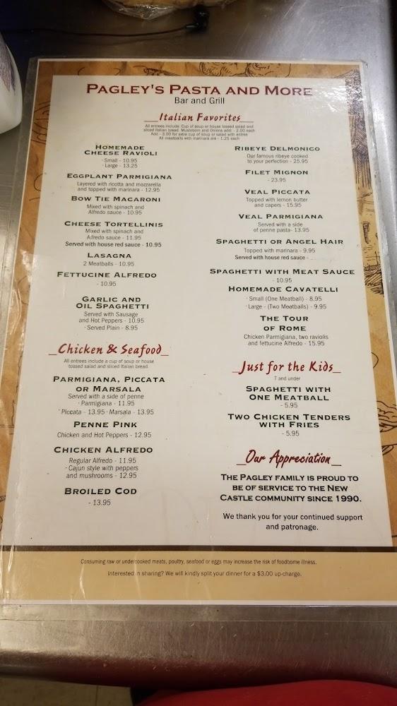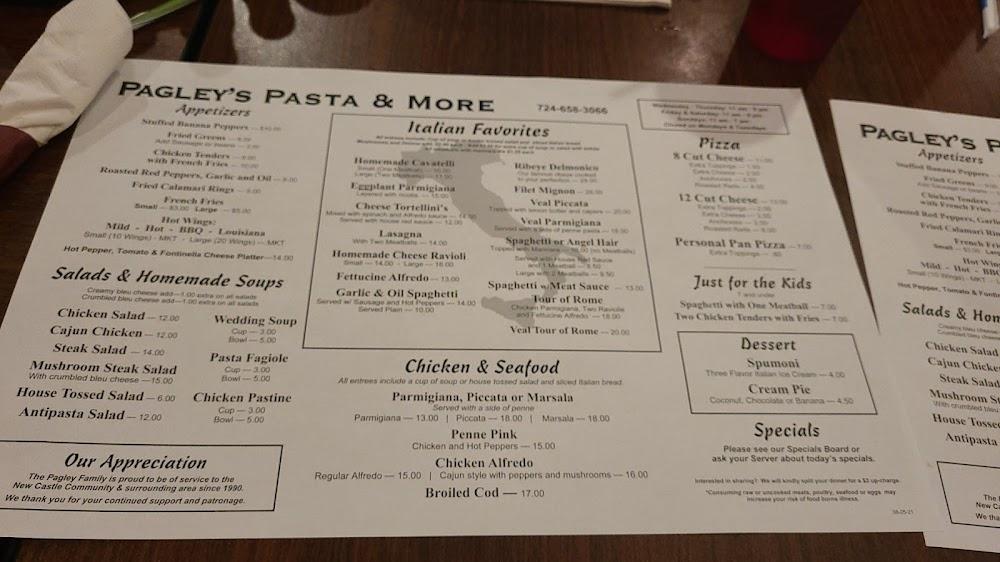 Welcome to Pagley's Pasta & More, your go-to Italian restaurant and pizzeria located at 1235 E Washington St, New Castle, PA. Enjoy a delightful dining experience with an extensive menu featuring traditional pasta dishes, local specialties, and a variety of cocktails, beers, and wines. Our cozy atmosphere is perfect for families, groups, or solo diners, with options for dine-in, takeout, and contactless delivery. We pride ourselves on fast service and accessibility, ensuring everyone feels welcome. Join us for lunch or dinner and savor the taste of Italy right here in New Castle! Reservations are accepted.